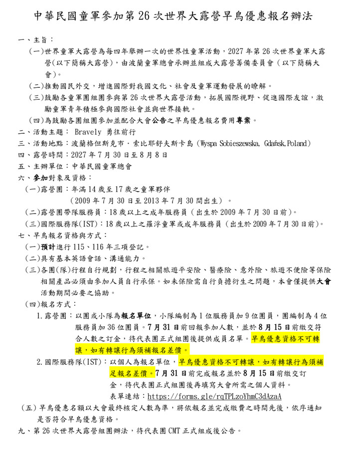 九、第 26次世界大露營組團辦法,待代表團CMT 正式組成後公告。