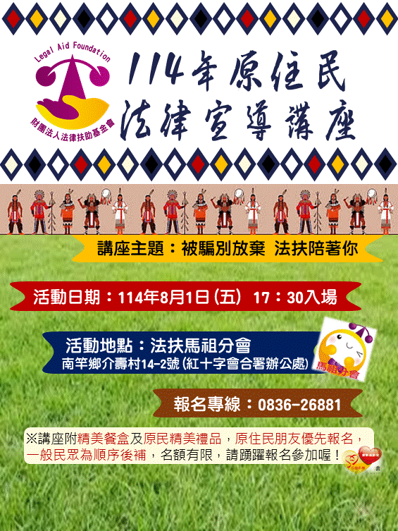 8/1原民專案法律宣導講座活動 --閱讀人次 : 714 財團法人法律扶助基金會法扶馬祖分會-114年原民專案法律知識宣導