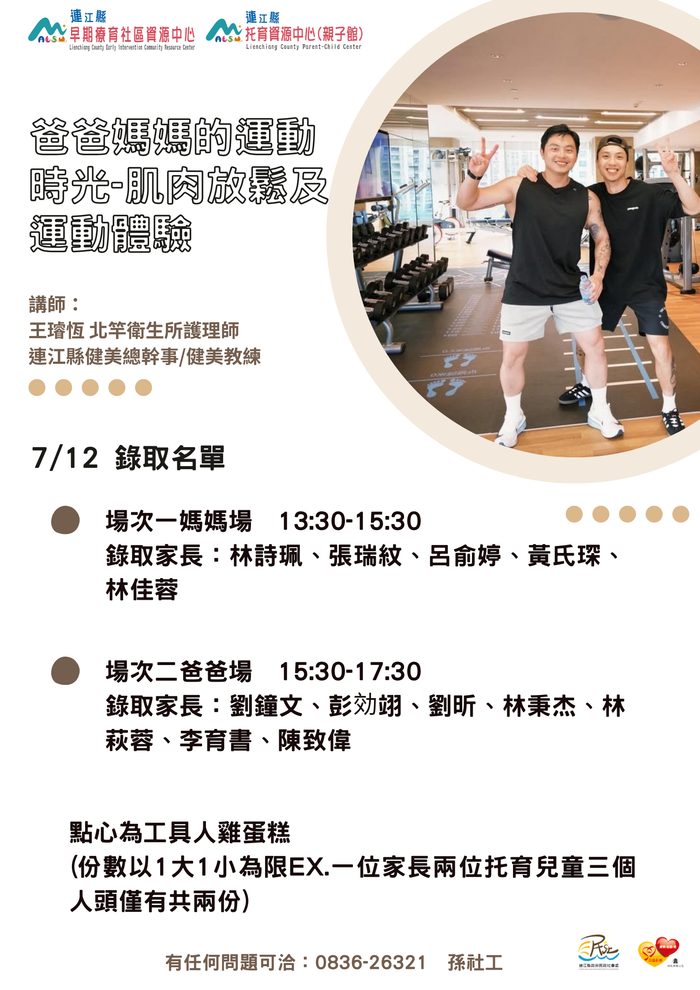 以下為07/12活動公告之錄取名單,若有疑問歡迎洽詢 (321親子童樂園)LINE ID:083626321 孫社工
