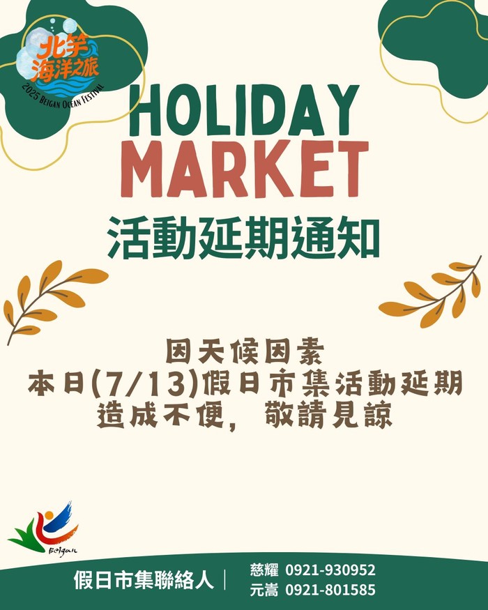 因今日(7/13)午後突發大雷雨,為了大家的安全與場地考量,原訂今晚舉行的【假日市集活動】將取消辦理,並順延至7/20(日)