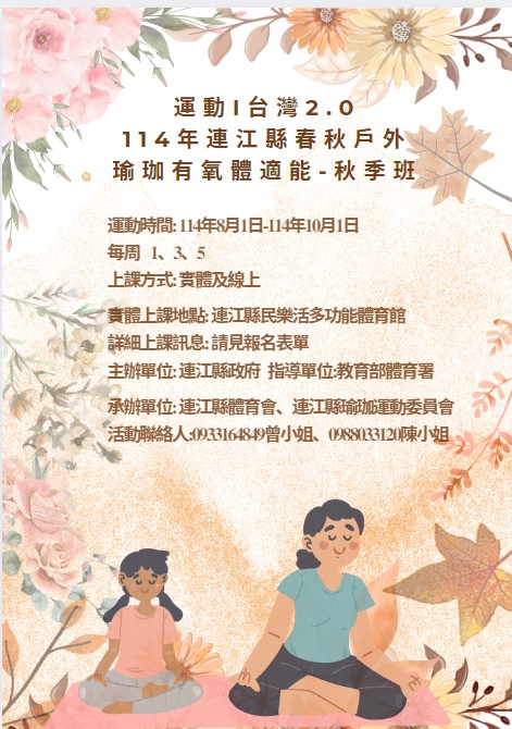 運動i臺灣2.0瑜珈有氧體適能-秋季班 --閱讀人次 : 1099 運動i臺灣2.0 114年連江縣 春秋戶外瑜珈有氧體適能【秋季班】開課囉~
