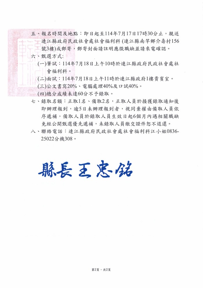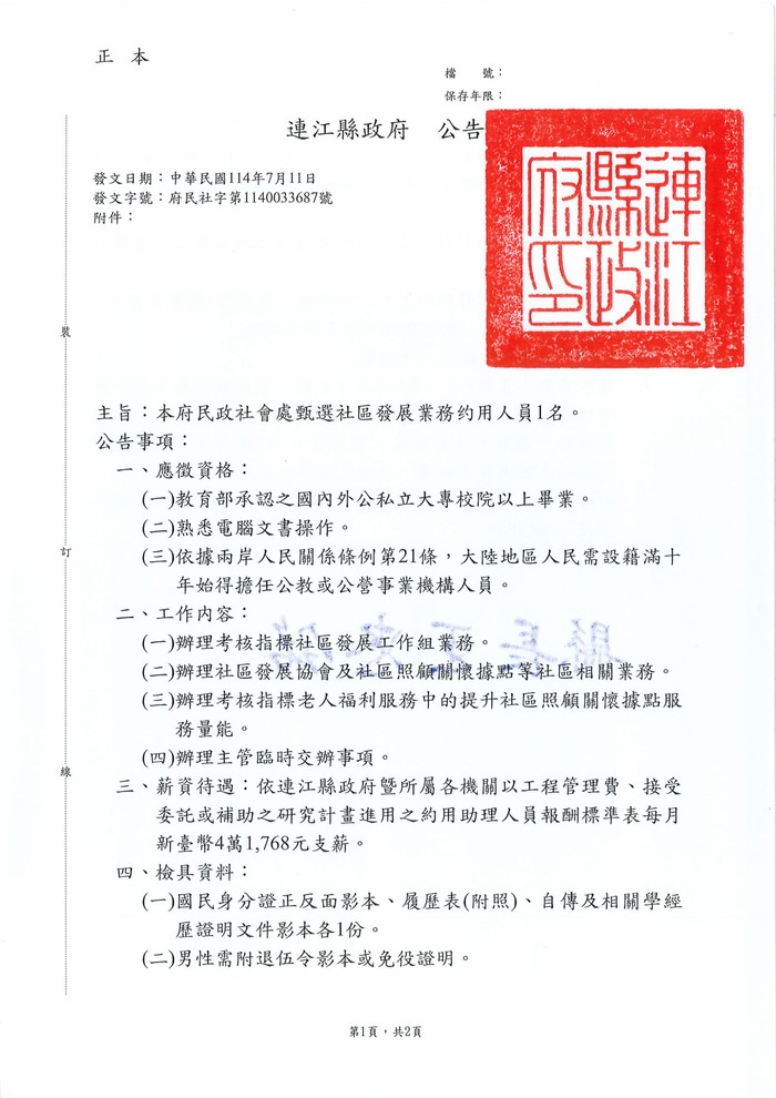 民政社會處甄選社區發展業務約用人員1名