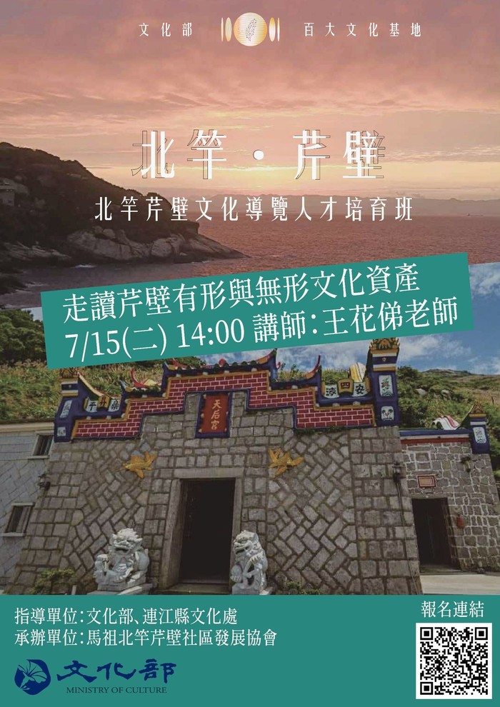 北竿芹壁2025年榮獲「文化部百大基地」殊榮.為傳承與推廣芹壁百年在地文化.促進馬祖觀光發展.特別推出導覽人才培育課程.讓您成為芹壁城鄉發展.海洋文化山城傳播使