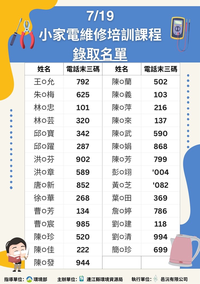 7/19小家電培訓課程【錄取公告】 --閱讀人次 : 765 為延續物命、減少資源浪費,並強化本縣家電自主維修量能。