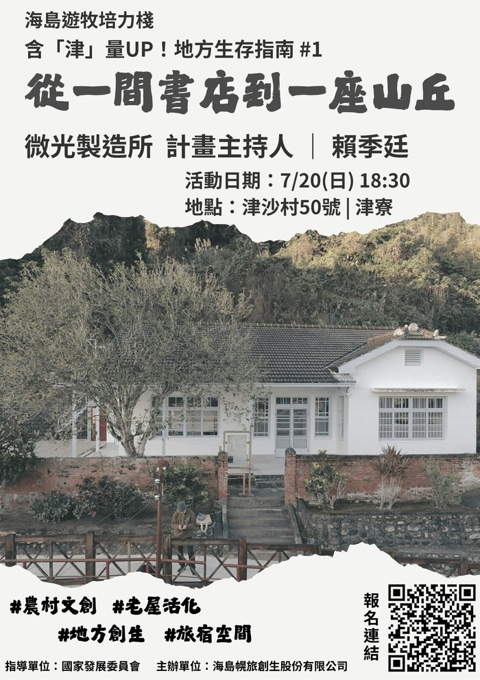 這次,我們邀請來⾃苗栗銅鑼的創⽣實踐者--#微光製造所計畫主持⼈-賴季廷與 #微光書旅主理⼈-賴世若,來⾺祖分享他們如何從⼀間 #獨⽴書店 出發推廣地⽅⽂史,⾛到 #⽼屋活化 賦予建築新的⽣命⼒、#農村⽂創 守護在地的杭菊,甚⾄發展 #旅宿空間 讓⻘年佇⾜的完整經驗。
