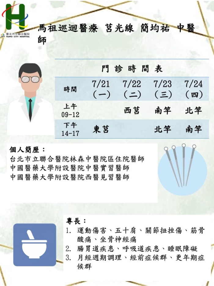 馬祖中醫巡迴醫療114/7/21-7/24由莒光線簡均祐醫師、東引線林宗翰醫師前往支援服務。
