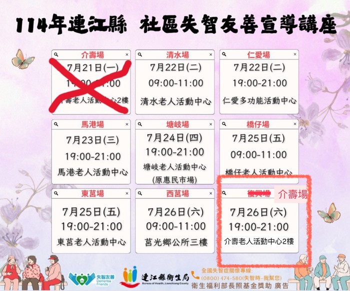 原訂於今晚 07/26 19:00-21:00 於復興村老人活動中心辦理失智友善宣導講座,