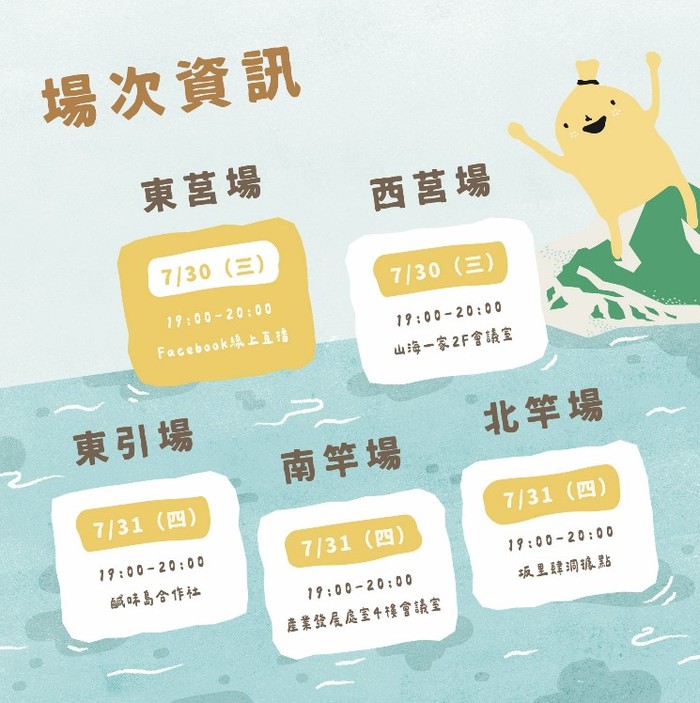 因東莒場次報名參與人數過低,將改以線上直播辦理,請東莒鄉親悠閒的在家收看即可,也歡迎四鄉五島若活動當天不便參與的人也可以觀看Facebook直播回放了解本次徵件更多細節!