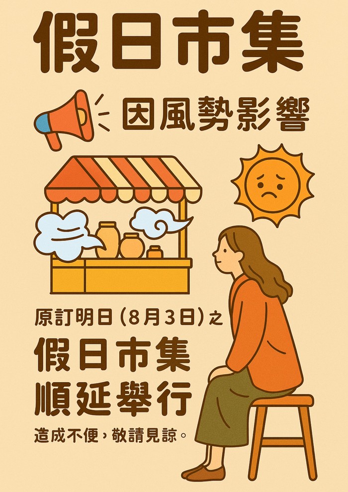 假日市集因風勢影響,原訂於明日(8/3)舉辦之活動順延。