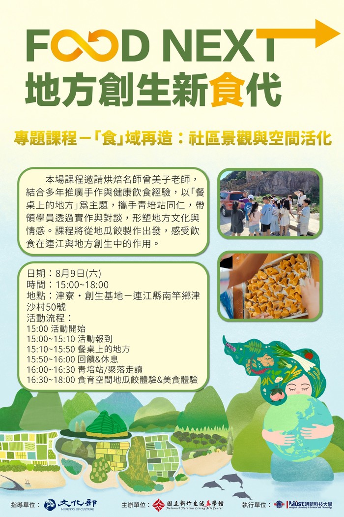 「FOOD NEXT:地方創生新食代」計畫以飲食文化為核心,串連地方創生團隊、文化基地與青年行動者,推出六場飲食 × 空間 × 教育 × 產業的實作型課程,讓大家透過親身走入社區、動手體驗的方式,深化飲食文化與地方經濟、社會的連結。