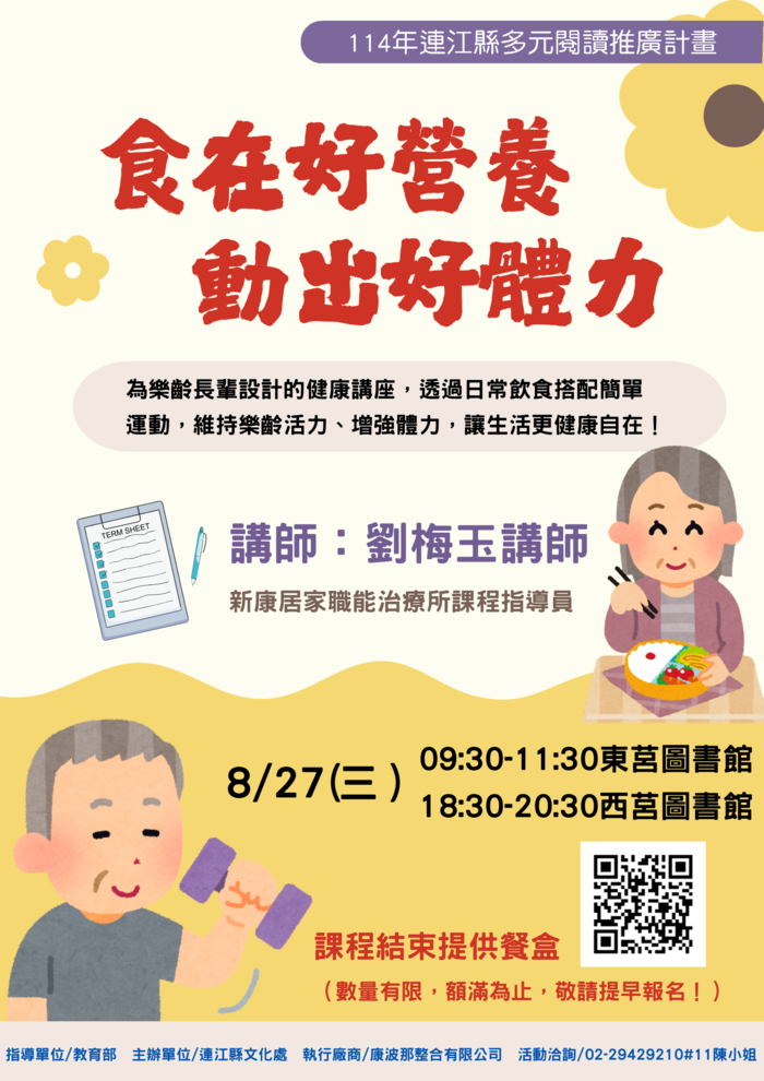 本場講座為「114年連江縣多元閱讀推廣計畫」系列活動之一,將於27日上午9時30分在東莒圖書館及晚上6時30分在西莒圖書館舉辦,邀請新康居家職能治療所課程指導員劉梅玉講師,針對樂齡銀髮族的營養攝取與簡易運動方式進行深入淺出的分享,幫助長者提升體力、維持活力,擁有更自在的樂齡生活。名額有限,歡迎有興趣的民眾掃描QR碼報名,或致電報名洽詢。活動洽詢電話:02-29429210 #11 陳小姐。