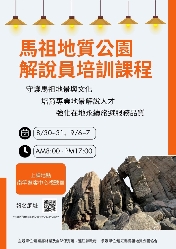為推廣地質公園理念、提升地景解說品質,並強化地區導覽與永續旅遊人力,連江縣政府主辦、馬祖地質公園協會承辦,將舉辦 「馬祖地質公園解說員培訓課程」。