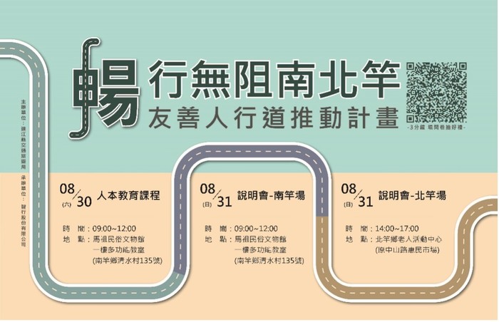 南北竿人本環境提升計畫-傾聽民意 --閱讀人次 : 644 為推動連江縣人本交通與友善步行空間,連江縣交通旅遊局將於8月30日辦理「友善人行道推動計畫人本教育課程」,透過學習與交流,廣納在地居民、村落、學校及相關機關的意見,攜手凝聚對南北竿人行環境改善的政策共識。