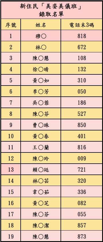 新住民「美姿美儀班」~錄取名單 --閱讀人次 : 888 新住民「美姿美儀班」~錄取名單