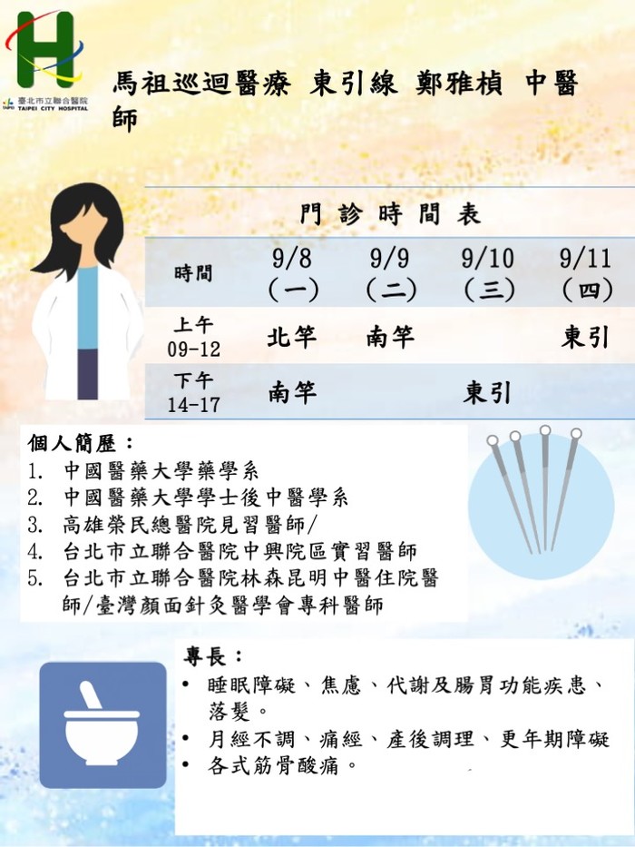 馬祖中醫巡迴醫療114/9/8-9/11由莒光線陳依庭醫師、東引線鄭雅楨醫師前往支援服務。