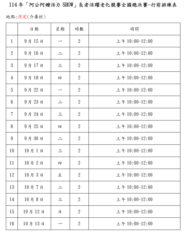 【報名資訊】長者活躍老化全國總決賽 --閱讀人次 : 565 114年「阿公阿嬤活力SHOW」長者活躍老化競賽全國總決賽