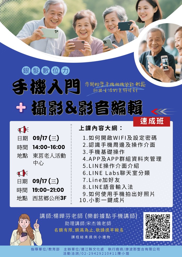 連江縣政府文化處特別規劃「銀髮數位力 — 手機入門+攝影&影音編輯速成班」,帶著長輩一步一步學會手機操作、拍照與剪片,享受分享日常的樂趣。