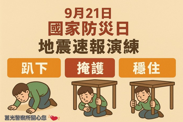 莒光警察所:114年「國家防災日」宣導,請立即進行自主性就地避難演練(趴下Drop【固定Lock】、掩護Cover、穩住Hold on)。