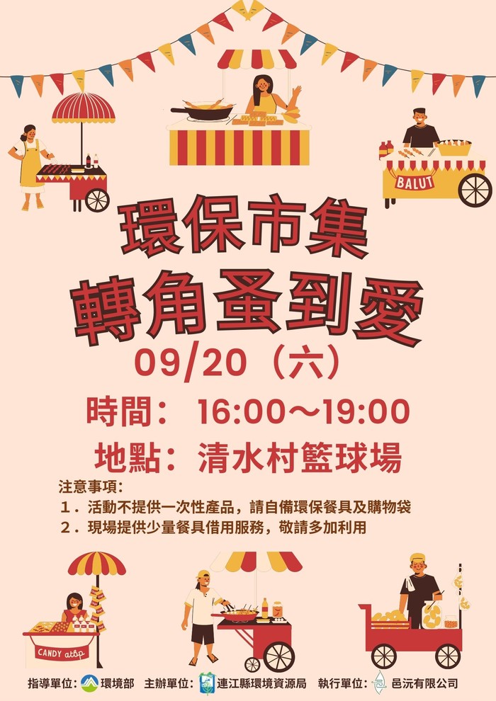 連江縣環境資源局將於 9月20日(星期六)下午4點至7點,在 清水籃球場 舉辦一場充滿綠意的 環保市集!