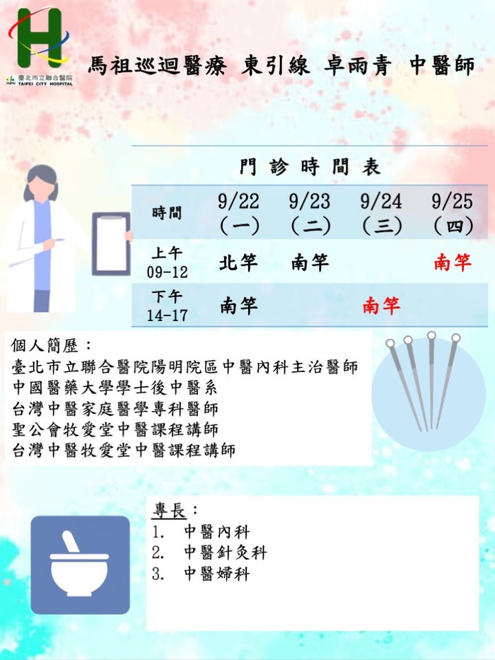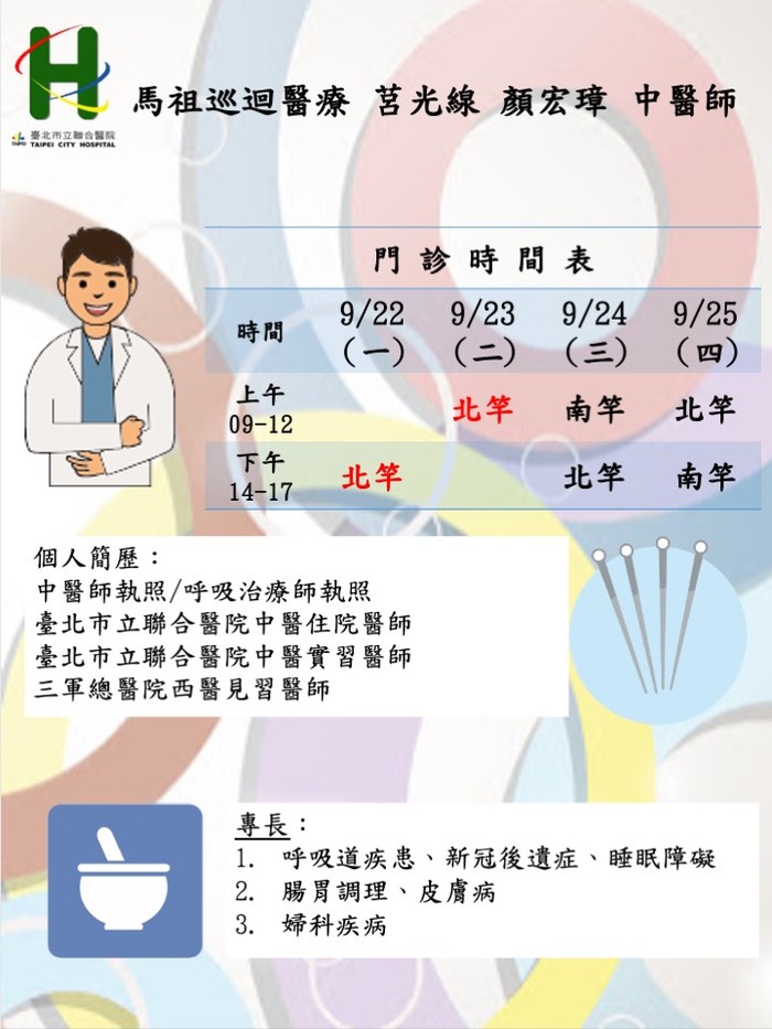 馬祖中醫巡迴醫療114/9/22-9/25由莒光線顏宏璋醫師、東引線卓雨青醫師前往支援服務。
