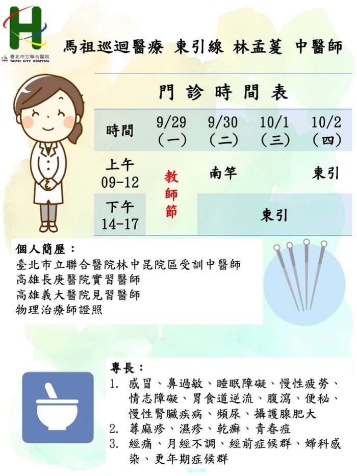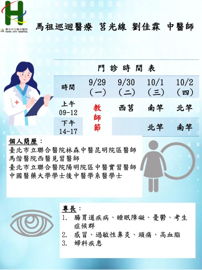 馬祖中醫巡迴醫療114/9/29-10/2由莒光線劉佳霖醫師、東引線林孟萲醫師前往支援服務。