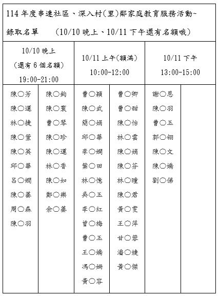 連江縣家庭教育中心活動~錄取名單 --閱讀人次 : 760 一、活動目的:推展家庭教育服務,主動將家庭教育資源送到社區需要的家庭手中,培力社區並相互加乘守護,引導與協助到更多的家庭健康成長