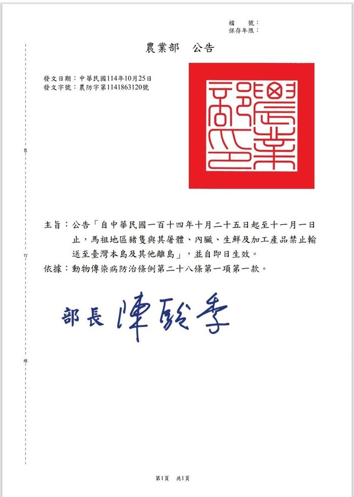 自即日起至11/1止,所有豬隻及其屠體、內臟、生鮮及加工產品,