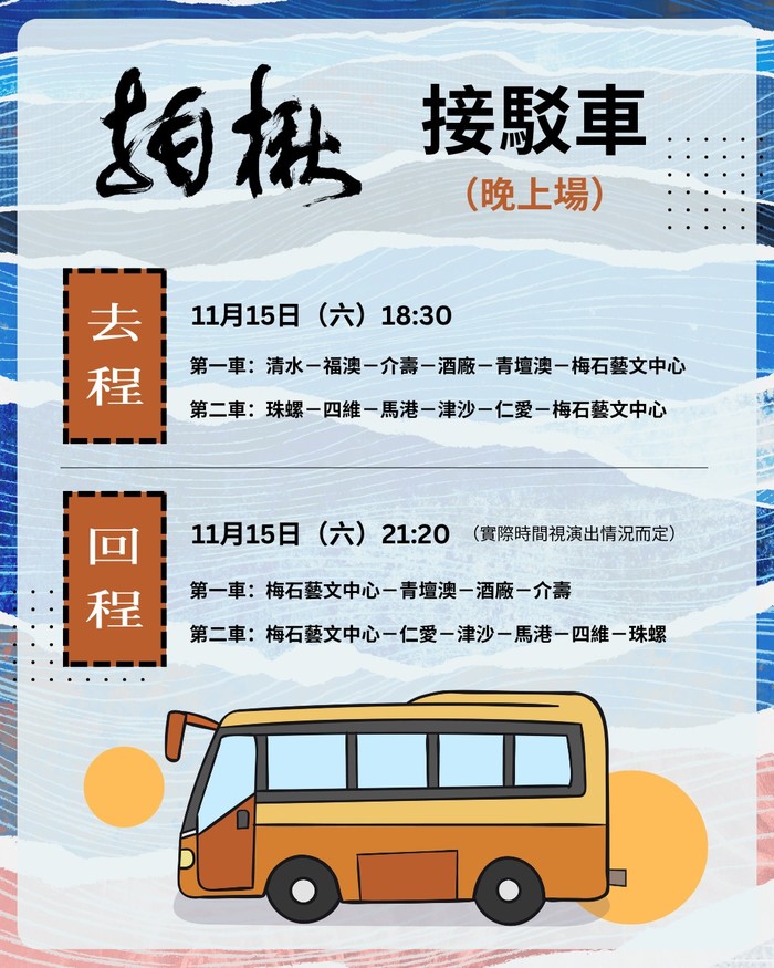 📍提醒:請觀眾依指定乘車地點準時候車,演出結束後請依指示搭乘返程專車。