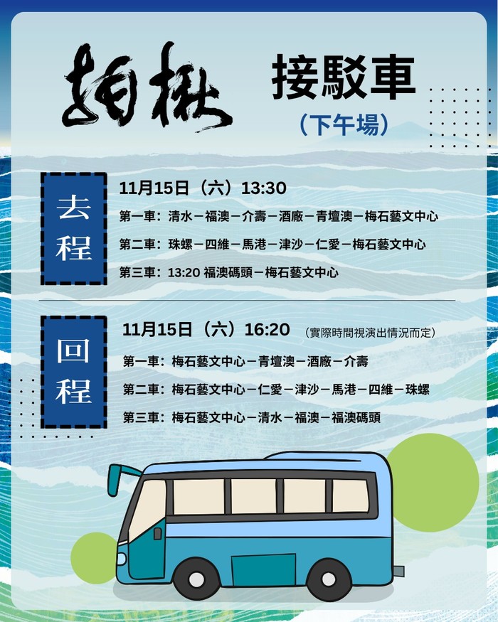 為方便觀眾觀賞11月15日(六)於梅石藝文中心登場的閩東語音樂劇《拍楸》,縣政府特別加開往返專車,請鄉親多加利用。