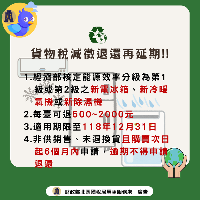 ♻退還減徵貨物稅再延期至118年12月31日♻