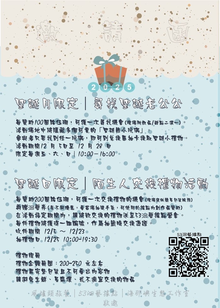 53洄藝據點聖誕企劃✨ --閱讀人次 : 686 🎄 53洄藝.陪你度過 2025 聖誕節|活動邀請函
