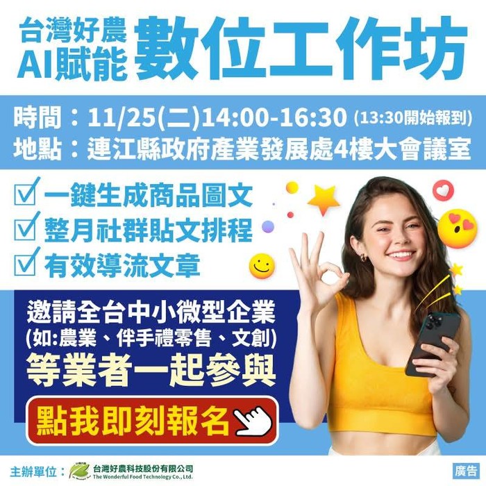 11/25 AI行銷工作坊開放報名! --閱讀人次 : 696 🌾 馬祖限定|AI行銷工作坊開放報名!