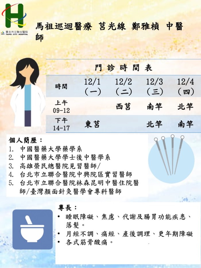 馬祖中醫巡迴醫療114/12/1-12/4由莒光線鄭雅楨醫師、東引線黃宇宏醫師前往支援服務。