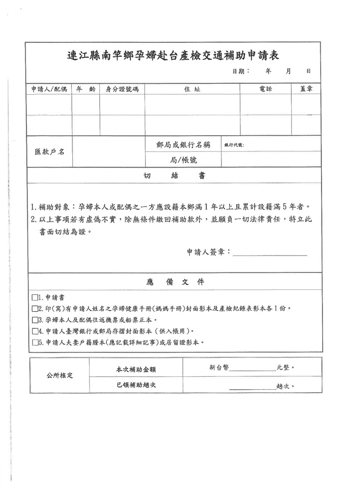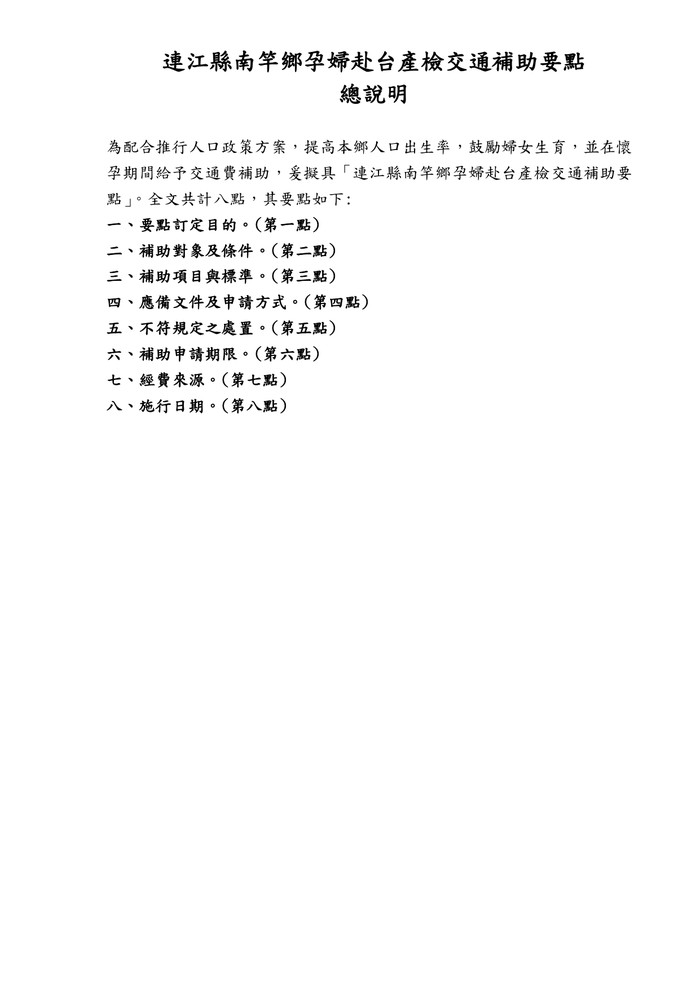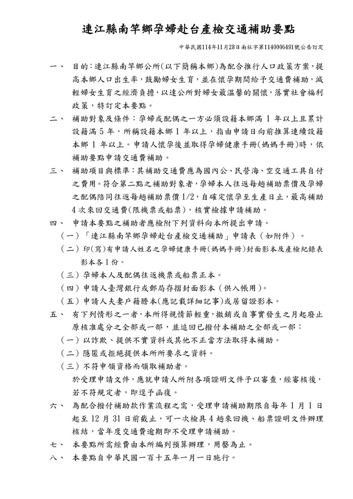 公告南竿鄉孕婦赴台產檢交通補助要點