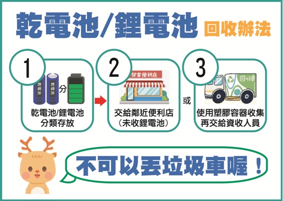 2. 認明回收桶最安心:連江縣各機關單位、學校、便利商店及資源回收站均設有「廢乾電池專用回收桶」,民眾可將廢電池交由回收單位統一處理。