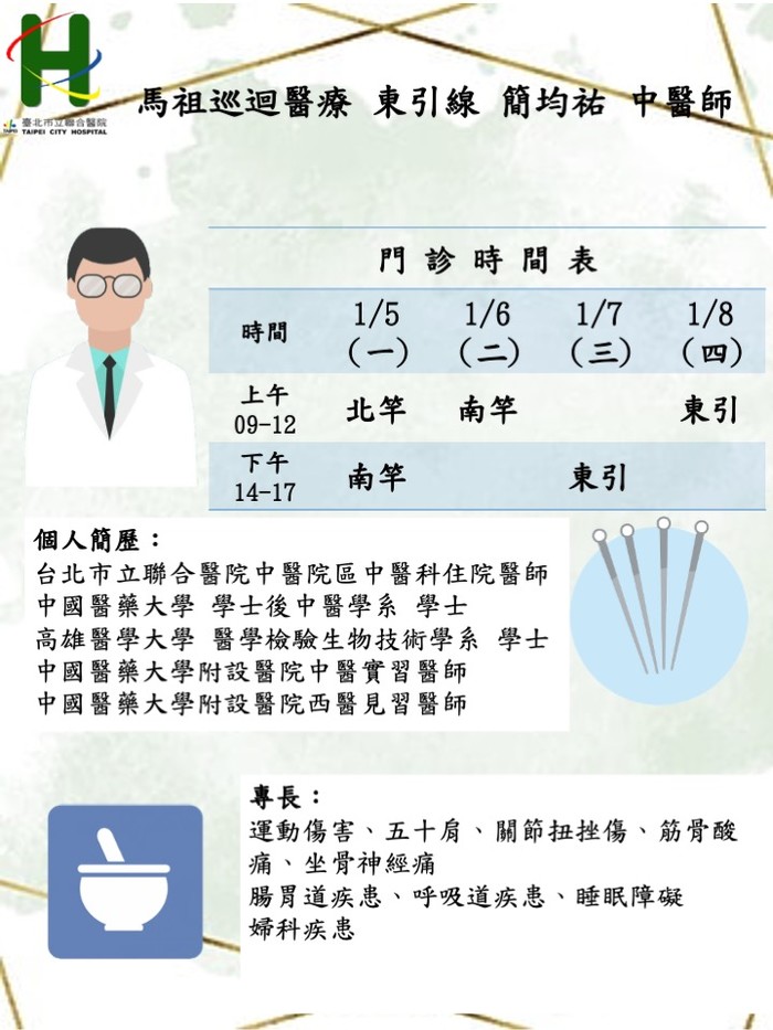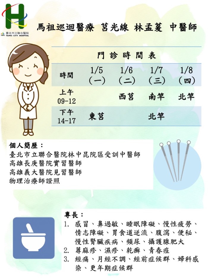 馬祖中醫巡迴醫療1/5–1/8由莒光線 林孟萲醫師、東引線簡均祐醫師前往支援服務。
