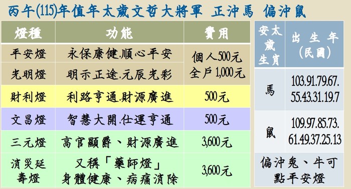 ★安太歲:正沖屬馬、偏沖屬鼠(兔、牛點平安燈即可)