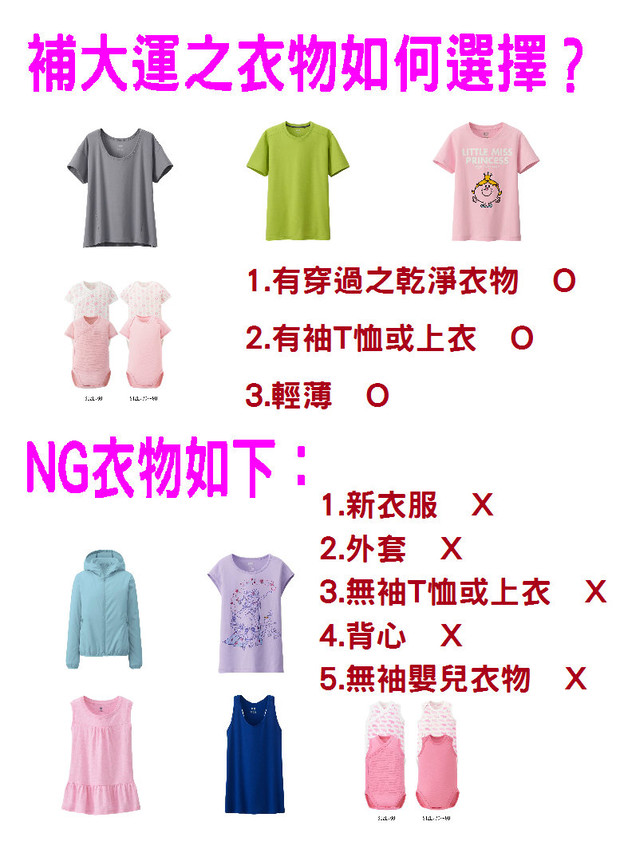 ★補大運:加強整體運勢不足之處!請準備輕薄、貼身且有袖的乾淨衣物。請提前一日【國曆2月23日(一)】前拿至壇內!(背心、新衣服、外套及家中有喪者皆不宜參加)
