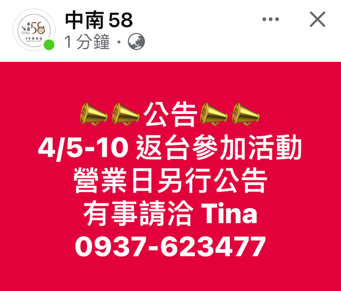 中南58店休公告