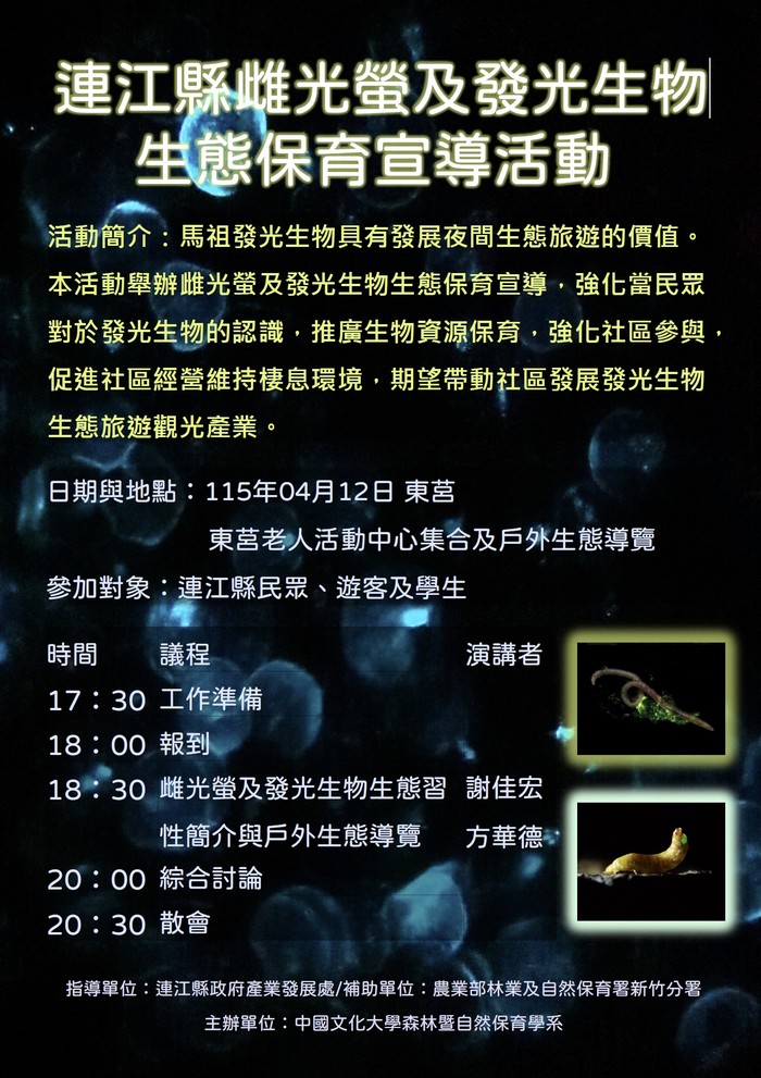 雌光螢生態保育宣導活動-東莒場 --閱讀人次 : 507 馬祖雌光螢具有發展夜間生態旅遊的價值。本活動介紹東莒黃緣雌光螢,強化當民眾對於雌光螢的認識,推廣生物資源保育,強化社區參與,促進社區經營維持棲息環境,期望帶動社區發展發光生物生態旅遊觀光產業。
