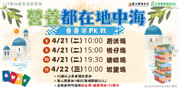 4/21、22營養都在地中海_北竿4場 --閱讀人次 : 438 歡迎65歲以上長輩踴躍參加~每人限參加1場次