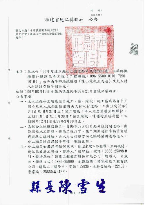 海線道路封閉公告 --閱讀人次 : 2790 主旨:為施作「96年度連江縣生活圈道路系統建設計畫─南竿鄉機場聯外道路改善工程(工程編號:096-5500-0101-7201-1010)」公告南竿鄉海線道路及夫人村入村道路交通管制措施。