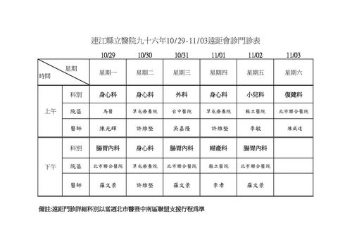 連江縣立醫院10/29-11/03遠距門診會診時間表