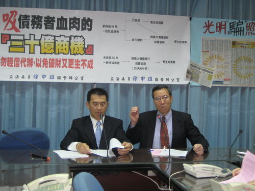 曹爾忠委員於四月八日偕同立委徐中雄召開記者會指出,「消費者債務清理條例」協助債台高築的債務人,透過法院訴訟程序,申請「更生」與「清算」,但法令上路之前,卻出現許多怪異現象,尤其是大張旗鼓招攬生意的「代辦更生」或「代辦清算」業者。