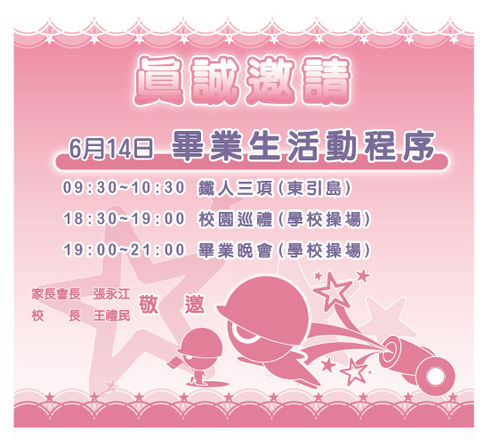 謹訂於本月十四日(星期六)六點三十分於東引國中操場~舉行畢業典禮