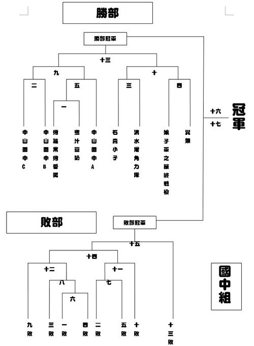 附加Word文件檔: matsu-59a315b1a39490889eb4a0760b81fc2c.doc國中組雙淘汰對戰表