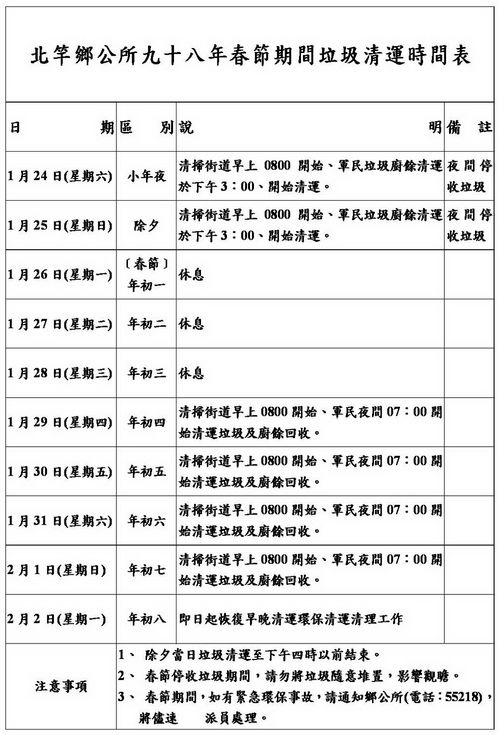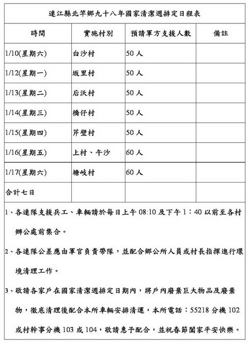 本鄉於本(98)年元月7日下午四點由鄉長主持召集各單位主官管、軍方代表及各村村長舉辦國家清潔週籌備會議,並排定九十八年國家清潔週各村執行日程表暨春節垃圾清理時間及垃圾廚餘清運時間表,敬請各家戶惠予配合辦理。