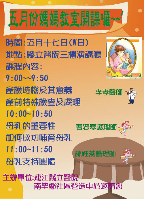 提昇孕婦進一步了解產前檢查時機及其意義,了解母乳的重要性並能產後成功哺餵母乳,連江縣立醫院、及南竿鄉社區健康營造將在五月十七日上午9-12時(週日)舉辦免費的媽媽教室講座,邀請準媽媽們帶著另一半來參加!!