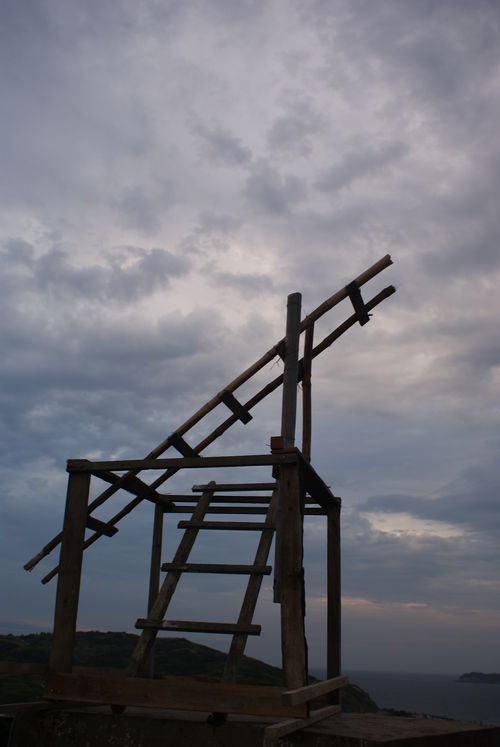 在右手邊上的最高點廢棄碉堡上,藝術家鄭愛華結合迷宮與天梯的裝置,訴說著容易迷失的人們急欲循著天梯尋找天堂,卻忘了天堂即在故鄉,即在當下。