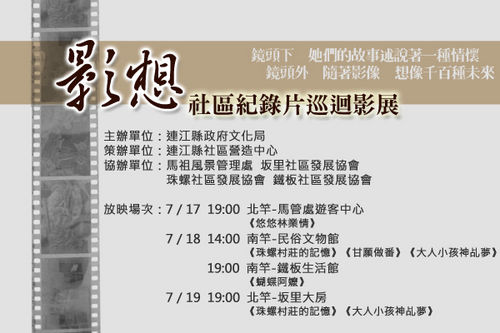 今年初在馬資網上紀錄北竿坂里的《大人小孩神乩夢》預告片,讓大家眼睛為之一亮,今年暑假眾所期待的完整版即將登場。由文化局主辦,社區營造中心策辦的「影想-社區紀錄片巡迴影展」,精選了五部馬祖與台灣各地社區不同面向主題的紀錄片,邀請大家跟著影像來一趟深度社區之旅。